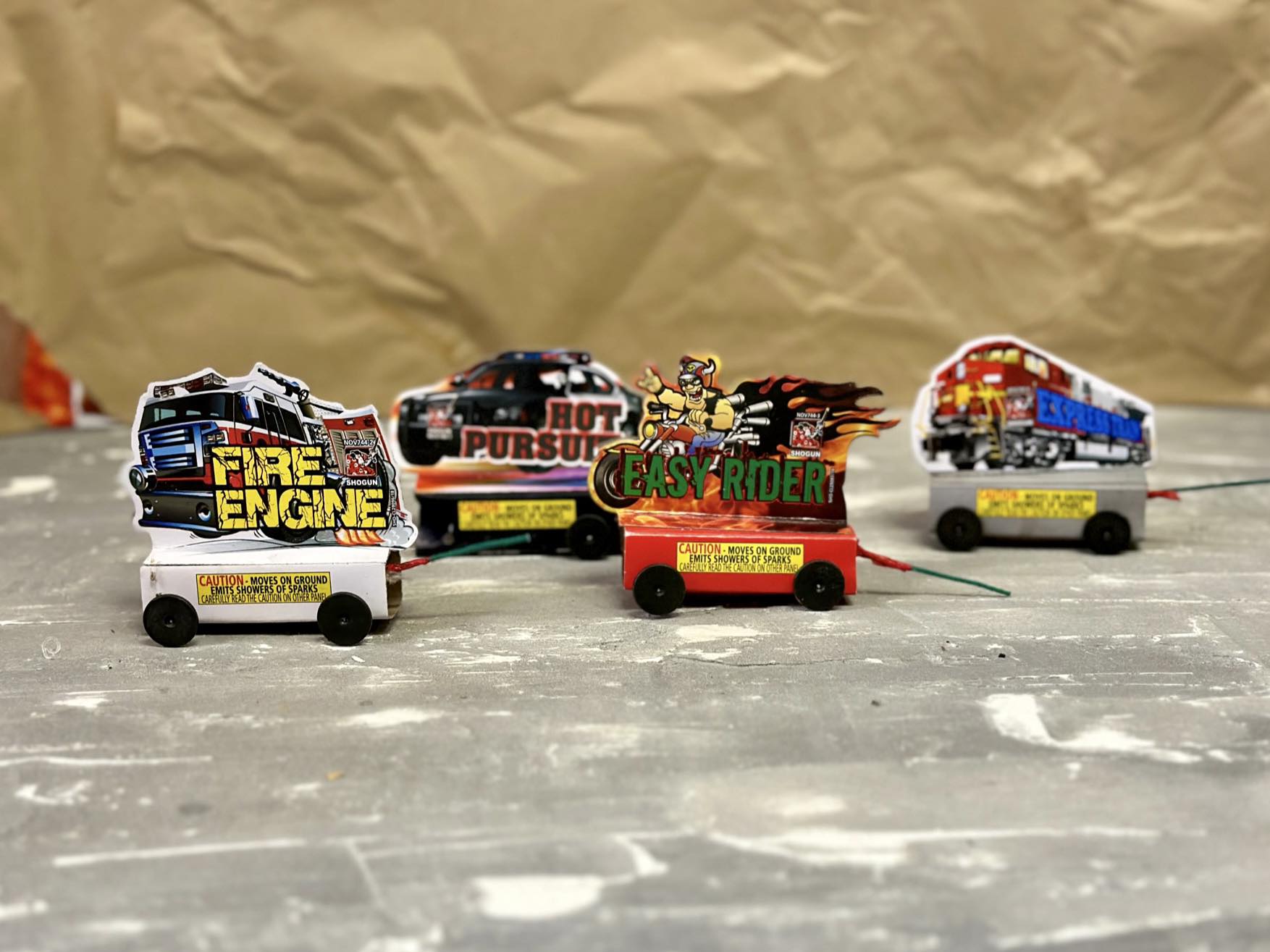 Put the pedal to the metal with Shogun’s Assorted Novelties! Each mini-vehicle on wheels (Express Train, Fire Engine, Hot Pursuit, and Easy Rider) provide kids with classic firework novelty fun as they roll around on the ground, emitting showers of colored sparks! A great time at a great price!