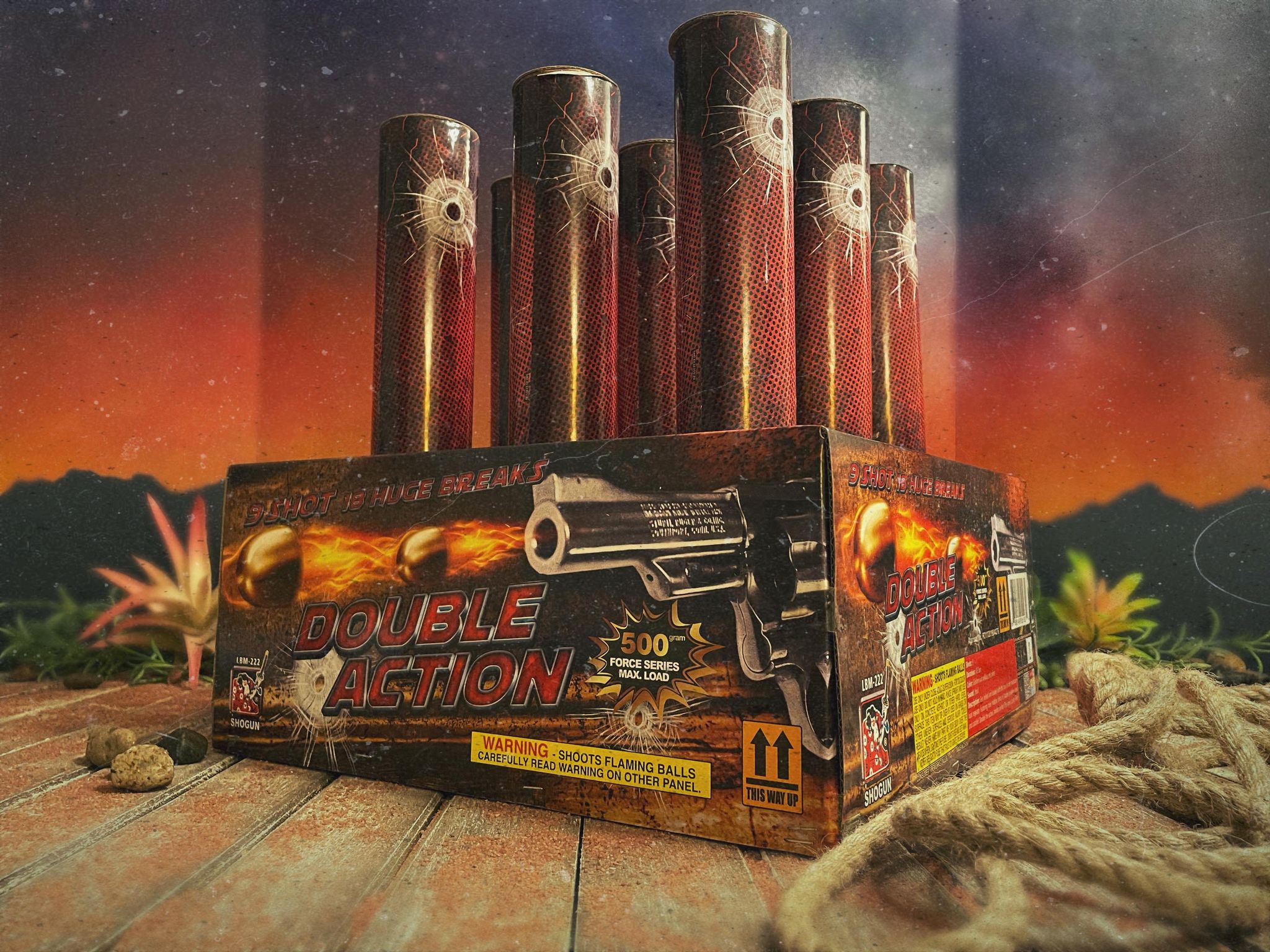 Prepare to get locked and loaded with Double Action! This awesome repeater features nine powerfully explosive double-breaking shells. First, the shells intimidate with red or blue-tipped chrysanthemums with crackling and then explode into a delay of MASSIVE sky-filling crackle. Double the action, and definitely double the fun!