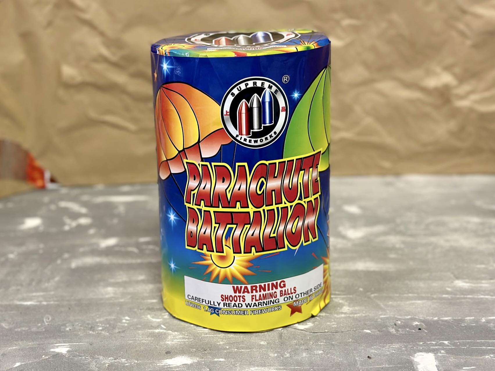 The boys are ready to sneak attack with Parachute Battalion! This eleven-shot parachute cake releases three parachutes per shot, filling the sky with comrades ready to fight on your behalf! A great daytime activity!