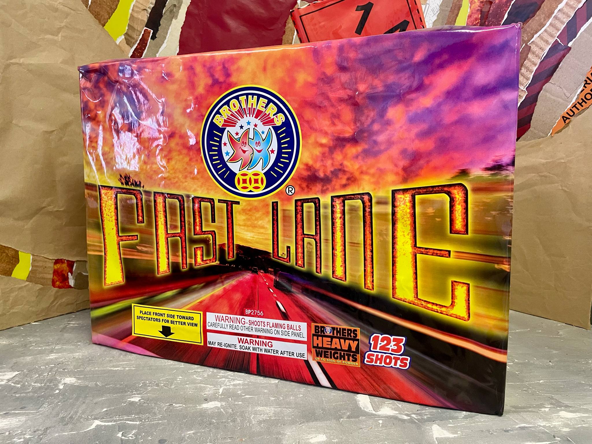 Sure to make you lose your mind! Try and keep up with Fast Lane! Features ONE HUNDRED AND TWENTY-THREE SHOTS of fast-moving angled glittering mines to alternating colors of comet tails with silver glitter, and silver glittering mines to rapid-fire sprays of brightly lit colored stars and a hard-charging finale of multicolored palms with silver glitter and chrysanthemums. These angled shots take up all lanes in the sky and come at you fast!