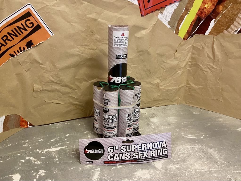 From the professional line of Spirit of '76, the Supernova reloadable cans deliver a wide range of high-quality ring effects. Six cans feature many unique effects, each with an accompanying donut/ring effect, such as double crackle, swimming pistils, strobe-to-time rain, glittering waterfall pistils, and more!