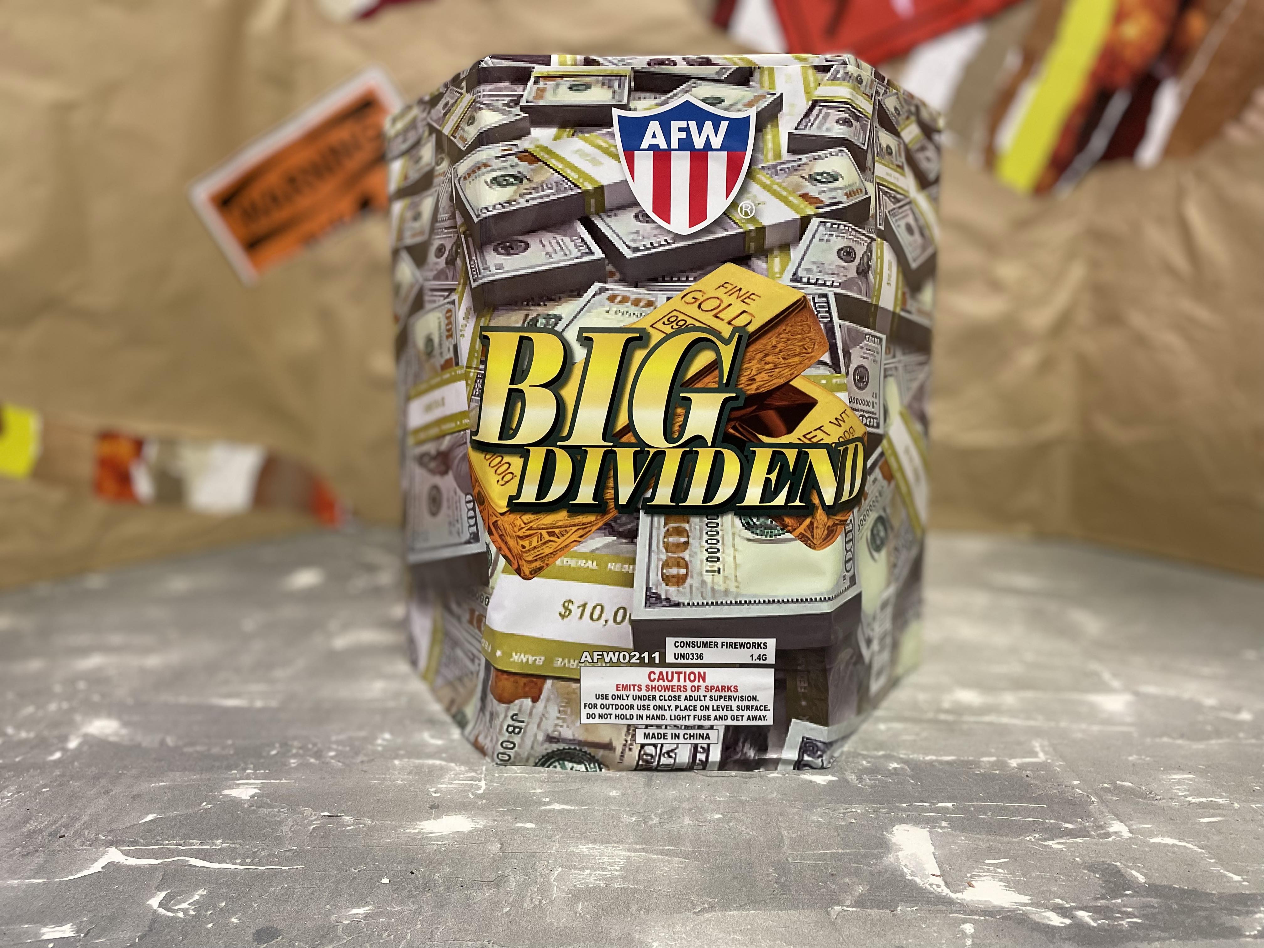 Cash in with Big Dividend! This three-minute-long fountain emits a wealth of richly colored chrysanthemums and an abundance of stars to a substantial amount of crackling! This is one fountain of value!