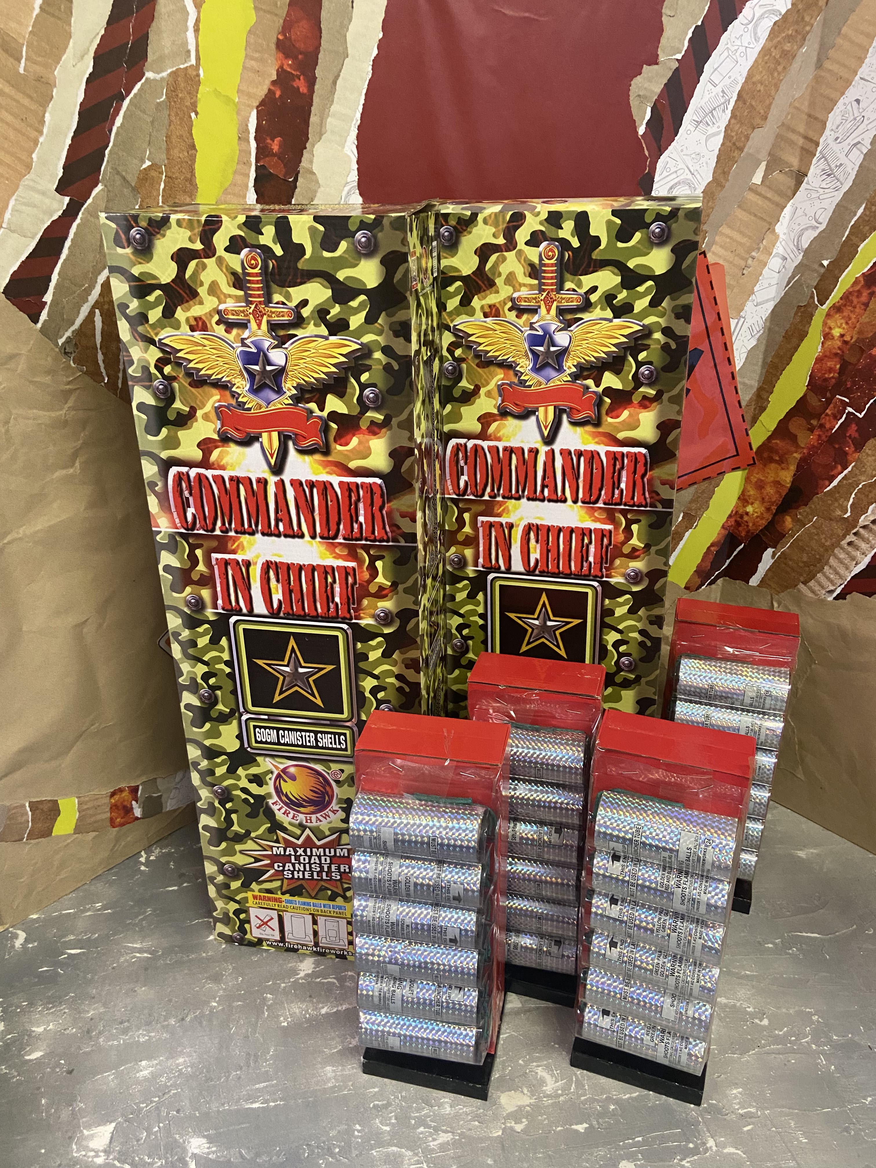These premium 4" canister shells are the boss! Commander In Chief offers twenty-four shells with two shells each per effect. This set has many different colors and effects for an absolutely amazing variety!