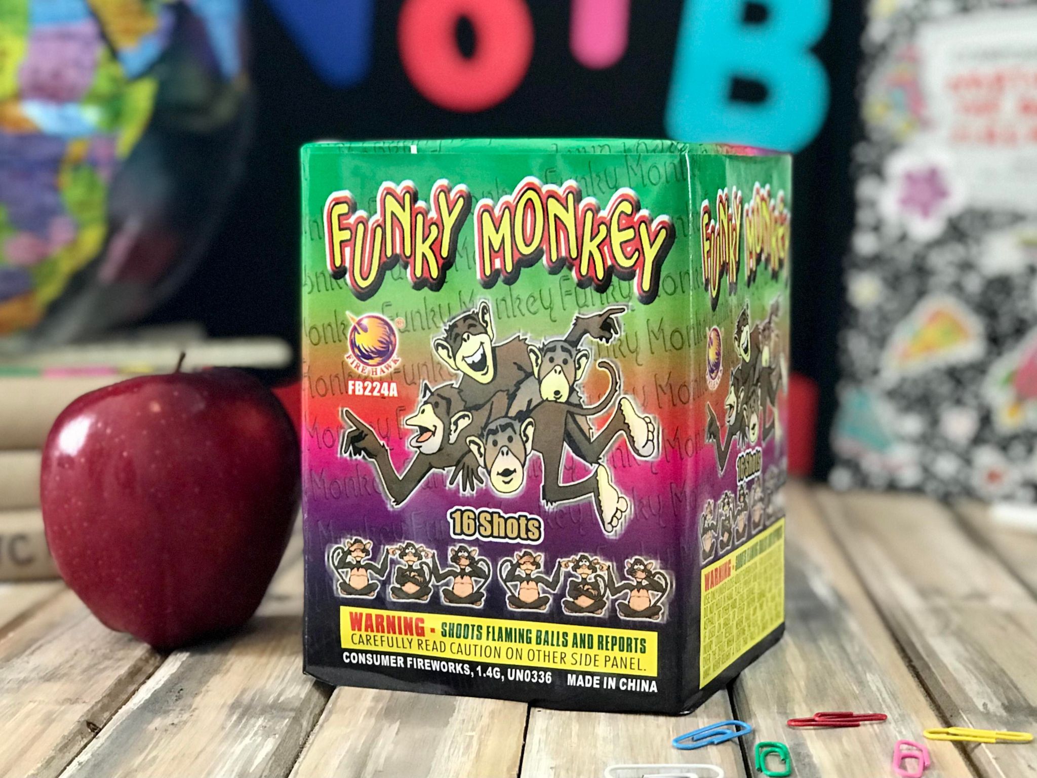 It’s a jungle out there with Funky Monkey! This repeater sends sixteen wild shots of multi-color glittering coconuts with crackling swinging through the sky along with big, curious brocades with strobing and glitter! This is one cheeky and funky repeater!