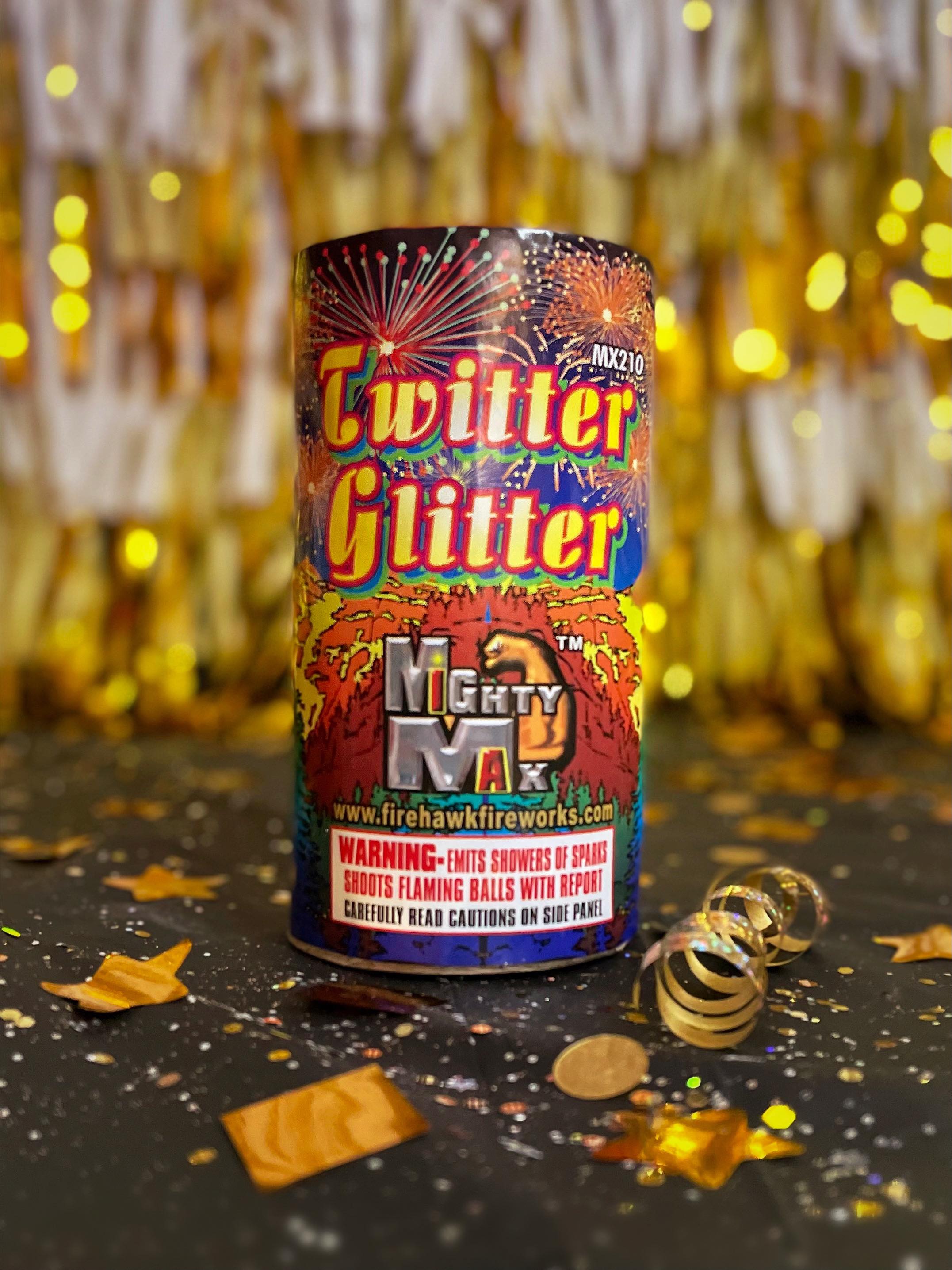 Get ready to dazzle with Twitter Glitter! This red and green fountain pumps out gorgeous silver glitter that sparkles for twenty seconds straight, followed by a beautiful grand finale of rapid-fire red and green balls, shooting up to 30 feet with loud report.
