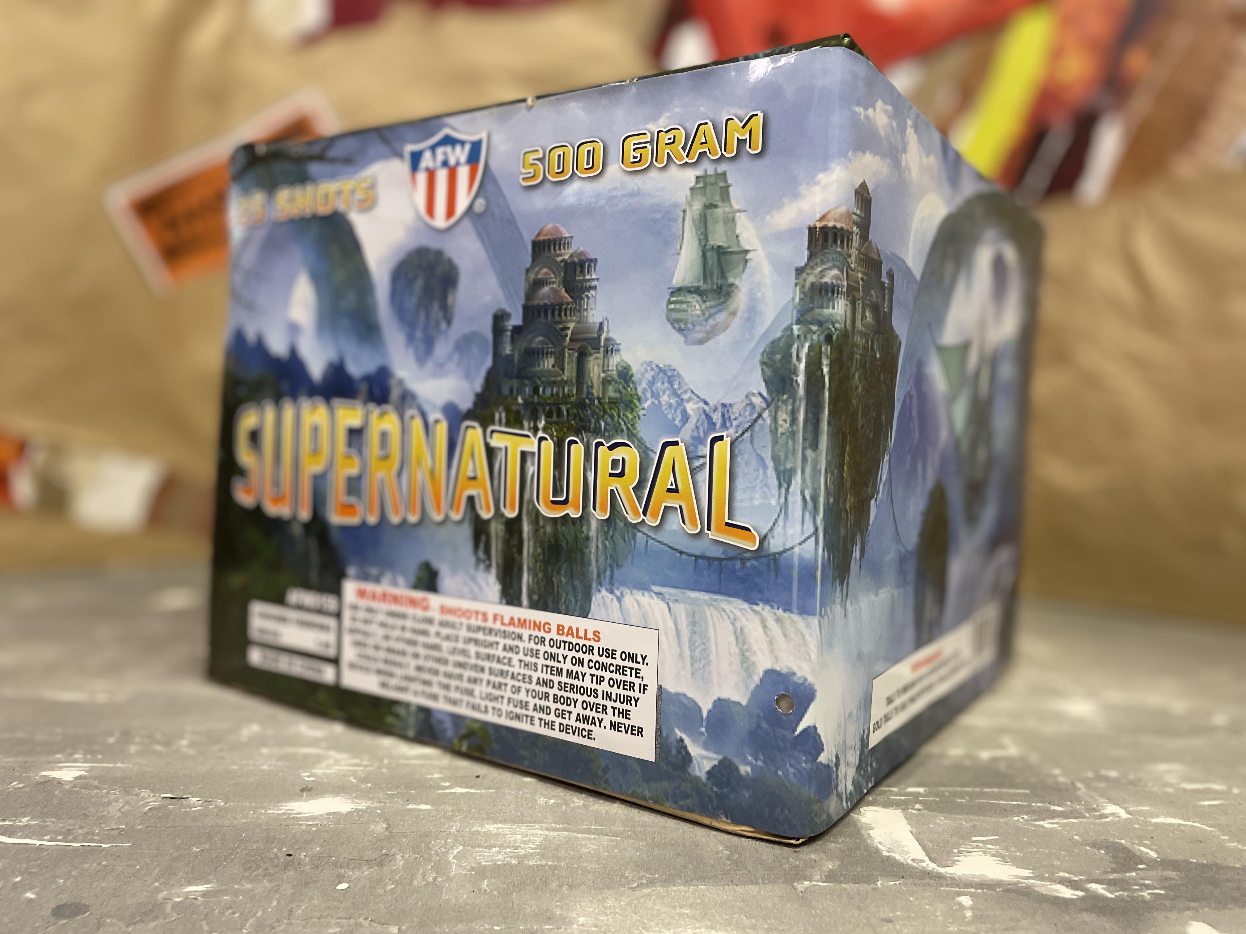 Unleash the Unknown with Supernatural. Spellbinding and ethereal, Supernatural lights up the night with a mystical sequence of ten glittering rising tails that erupt into spellbinding bursts of red and white shimmering brocades. Next, a rapid-fire succession of mesmerizing golden rising tails transitions into hypnotic golden palms, punctuated by enchanting blue stars, for an unforgettable display of twenty-five shots that defy reality and push the limits of imagination!