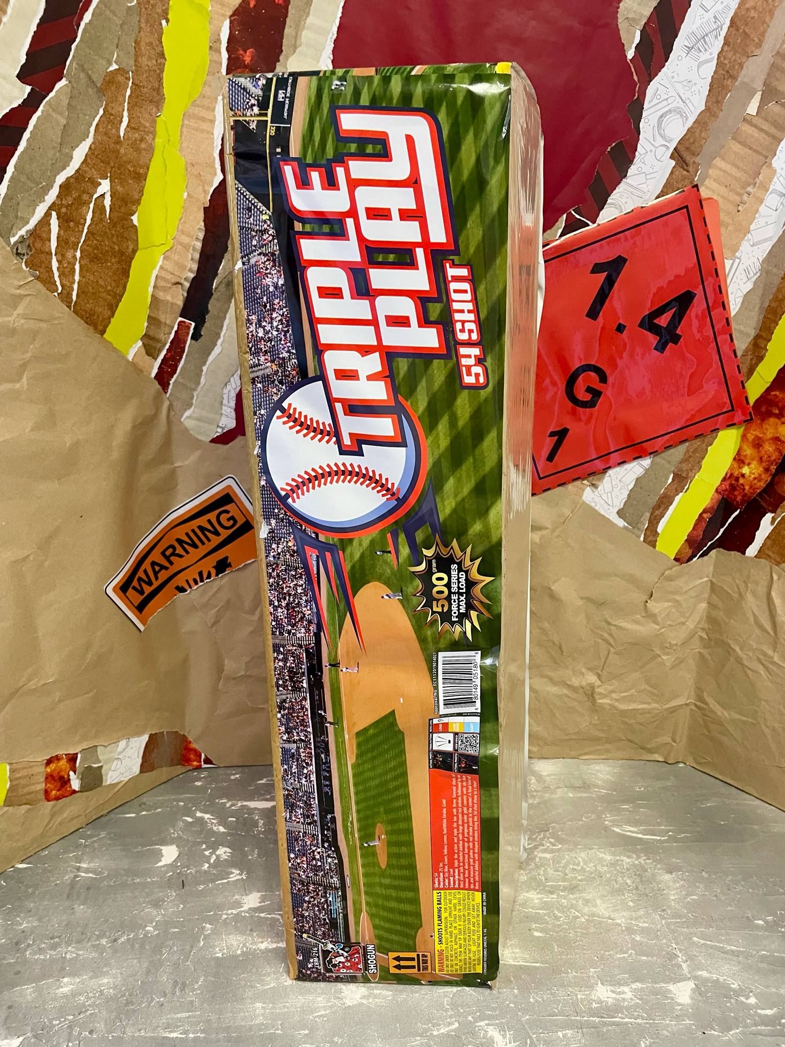 Fanned shots of thick silver tails to multi color dahlias with delayed red strobes. Then a barrage of outer gold comets with sky blue tips and large gold palms with red strobe pistils in the center. Three shot finale of multi-color dahlias with delayed strobes. A seriously unique showstopper!