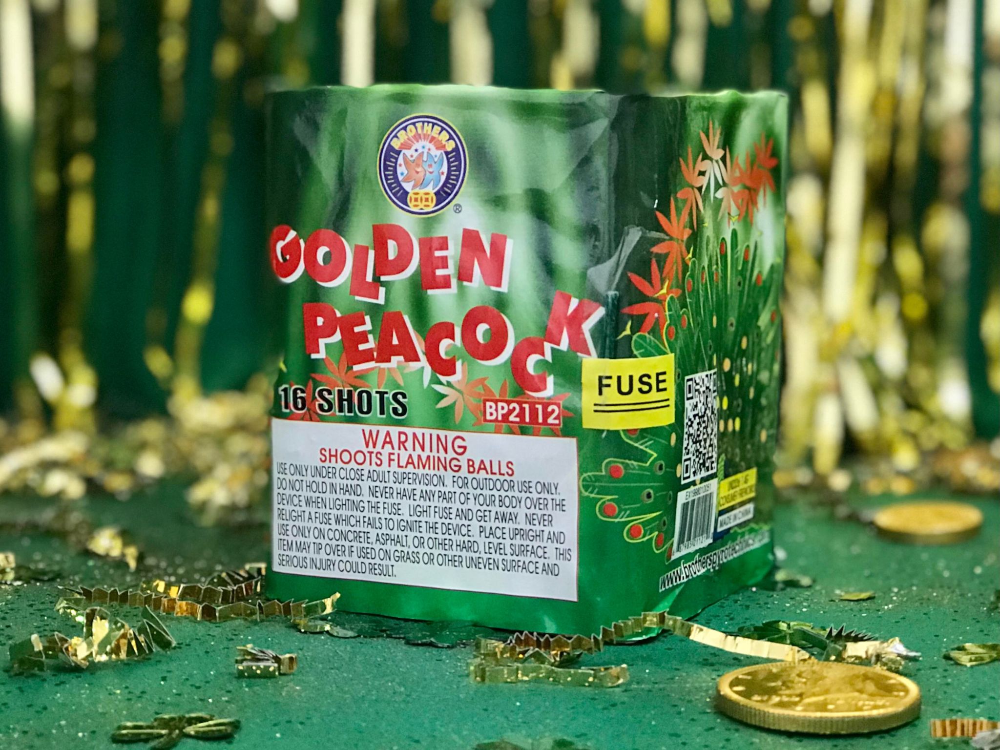 Dazzle the crowd with this 200-gram repeater from Brothers Fireworks. Golden Peacock aims to impress while lighting up vibrant green tails to dazzling green bouquets that twinkle and crackle! What a dance!