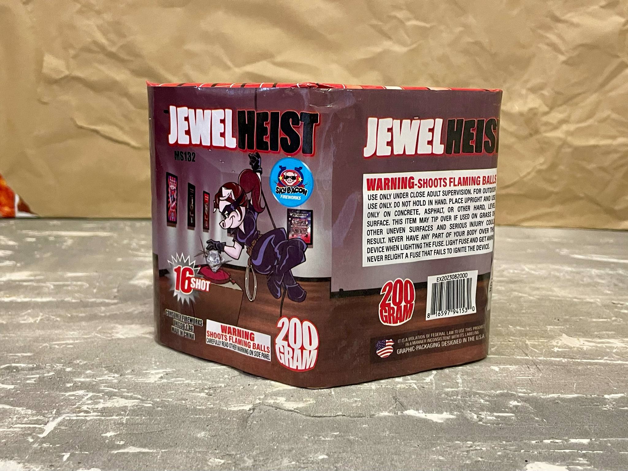 Make out like a thief with Jewel Heist! This dazzling repeater features sixteen sparkling shots of gem colored red peonies with white strobe, green peonies with red strobe, purple peonies with green strobe, and blue peonies with twinkling golden strobe.