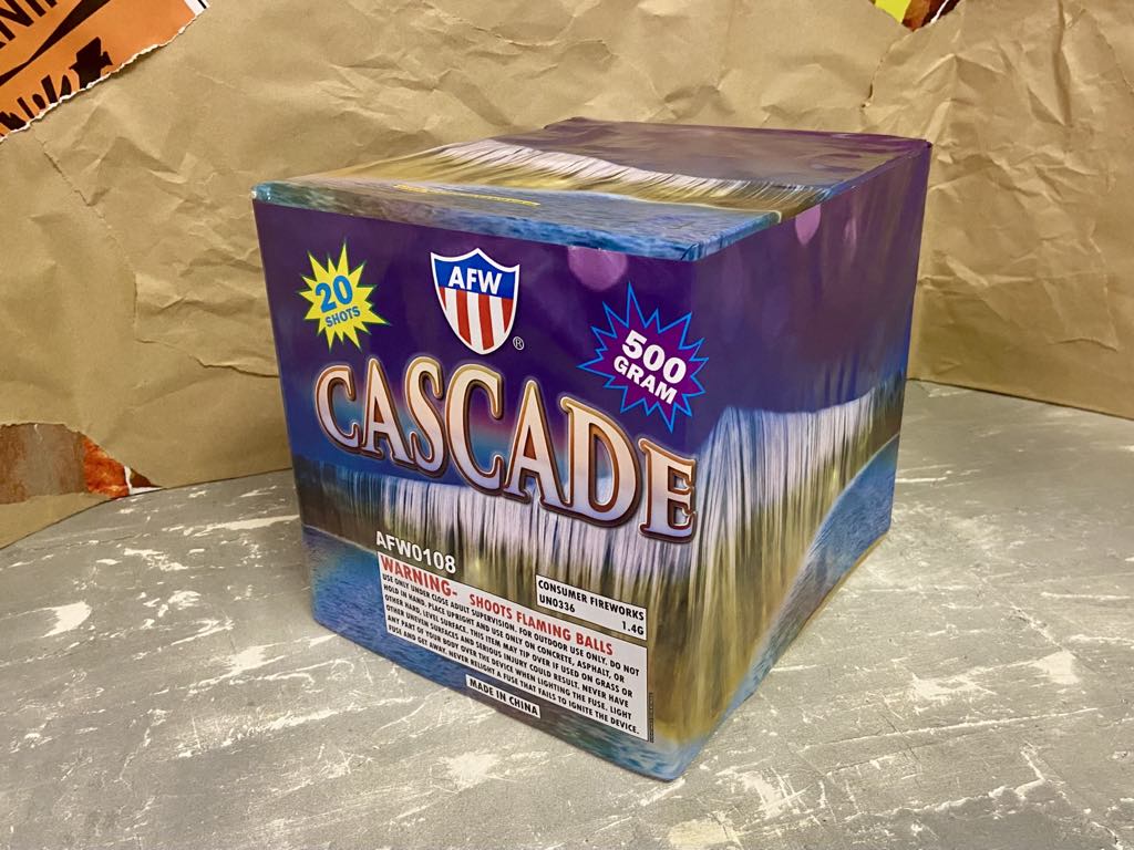 A super unique effect to include in your next firework show! This 500-gram repeater blasts 4 shots of awesome waterfall effects at a time that twinkle and cascade down the sky. Cascade ends with a 4 shot finale of extra-large, golden stars. Glittery and beautiful!
