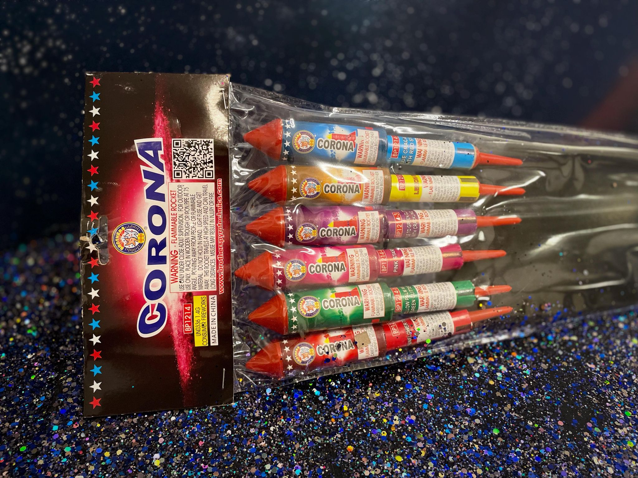 An awesome multi-pack of rockets that gain amazing height and display a great variety of fun-colored effects! Contains one rocket of each effect: Blue crackling with red stars, Lemon stars, Purple to green glitter with crackling, Pink stars, Yellow palm with green glitter, and Sunflower to red stars.
