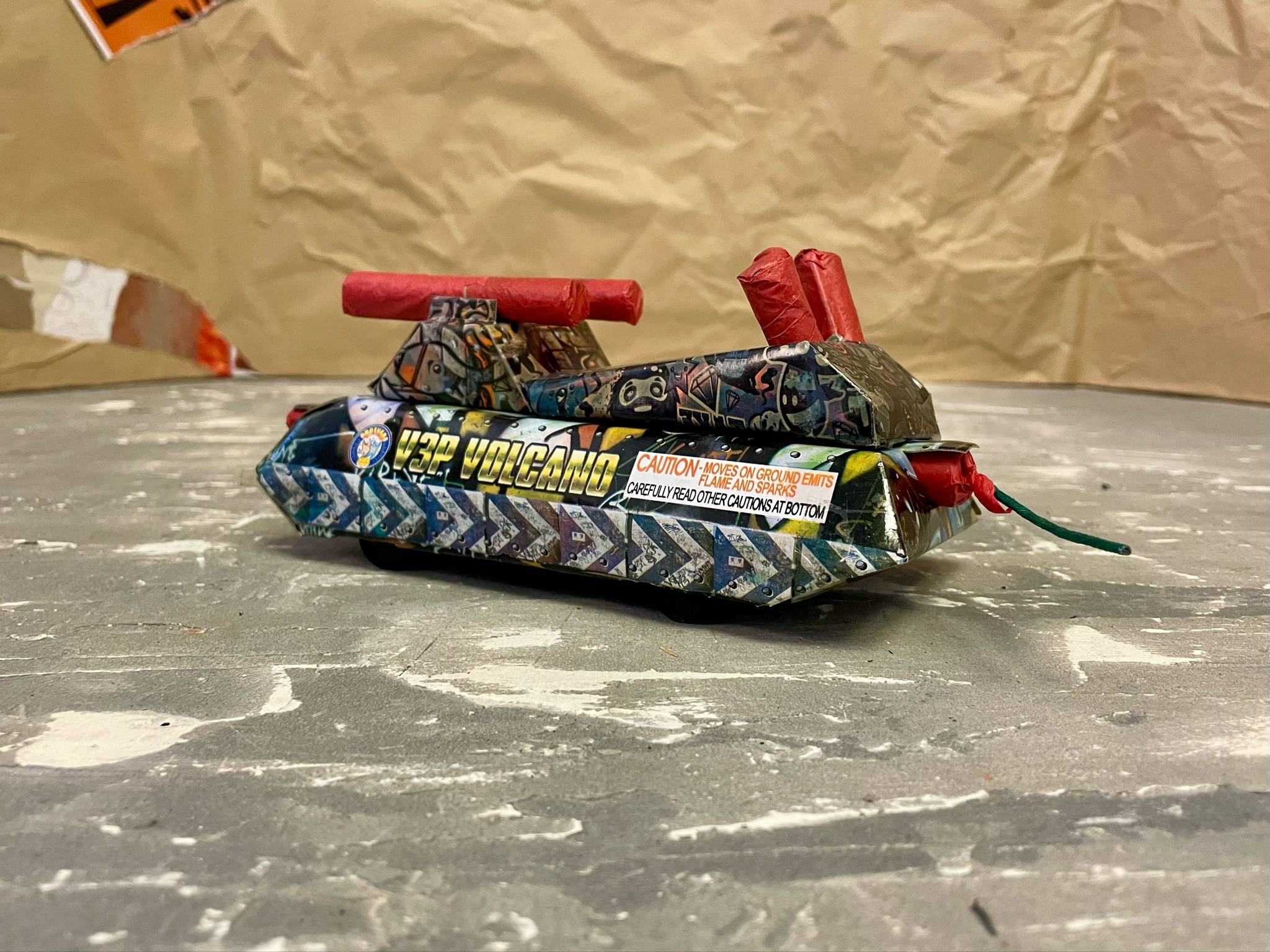 Alert the squad and roll out with this mega tank! It gets the troops ready for battle with a red, sparking flame and a loud whistle as it takes off, defeating the enemy with white smoke, more flames, shots of multicolored stars, and blinding silver light!